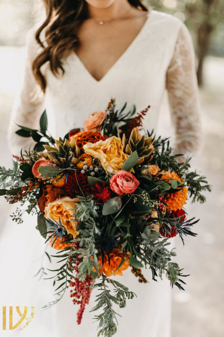 با وجود رنگهای پرجنب و جوش و شکوفههای پاییزی در همه جا، انتخاب دسته گل عروس بسیار آسان است. برخی ممکن است این تصور را داشته باشند که عروسی در پاییز برای تم روستایی فقط قابل اجراست.
